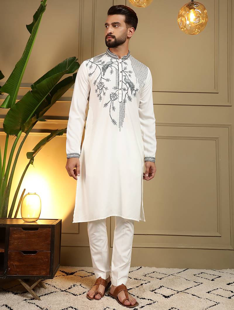 Men's White Viscose Silk Sequins Embroidered Kurta With Pajama Set