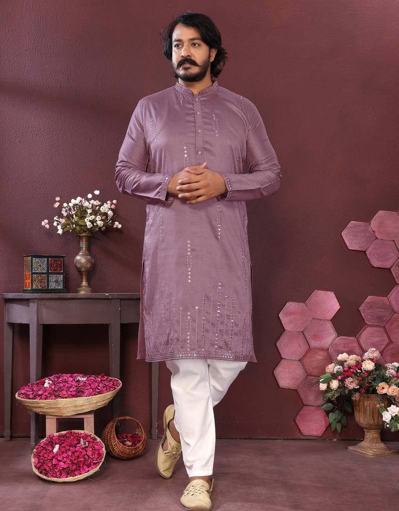 • Product Id : 4707564 • Package Details : 1 Kurta /1 Trouser Pant • Type : Kurta Pajama • Region : India • Fabric : Silk • Work : Embroidered • Type : Mirror Work • Look : Traditional • Sleeve : Full Sleeve • Neck Style : Chinese Collar Kameez • Color : Purple • Bottom Fabric : Cotton • Bottom Color : White • Top Color : Purple • Top Fabric : Silk • Bottom Style : Pyjama • Stitching : Stitched Payments [+]