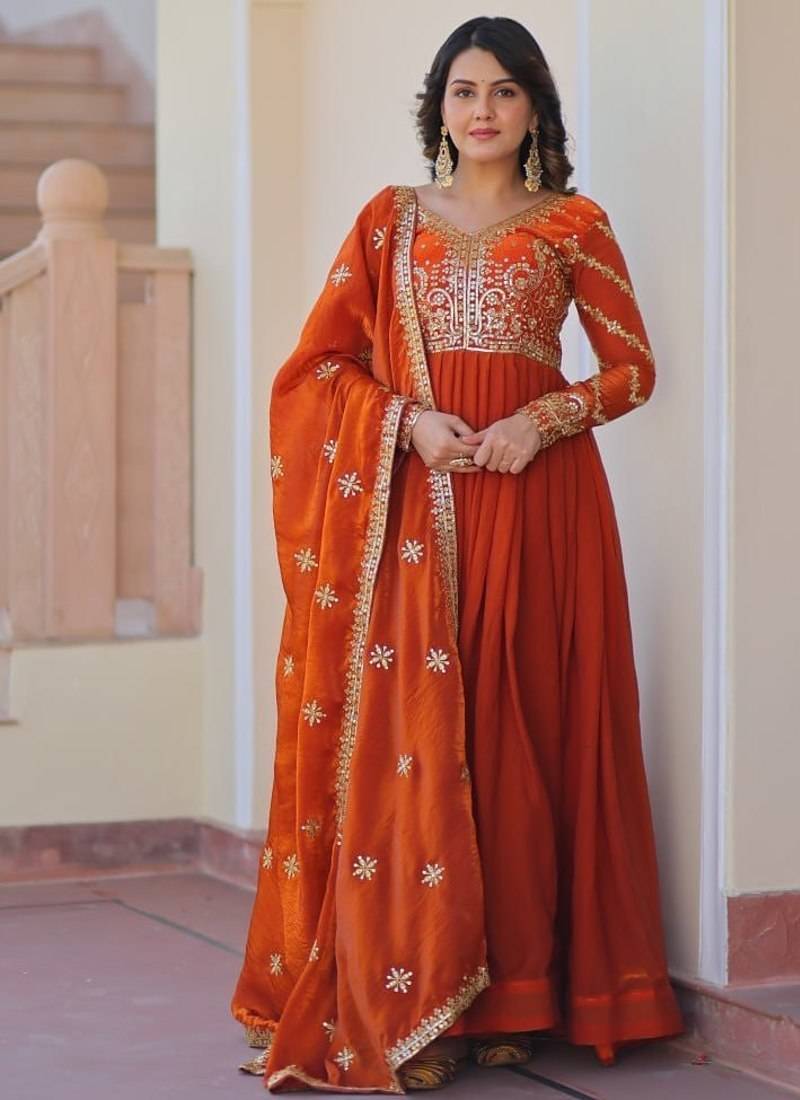 • Product Id : 4700263 • Package Details : 1 Anarkali / 1 Dupatta • Type : Anarkali Suit • Region : India • Work : Embroidered • Type : Sequins Work • Look : Designer • Sleeve : Full Sleeve • Neck Style : V Neck • Fabric : Silk • Color : Orange • Stitching : Stitched Payments [+]