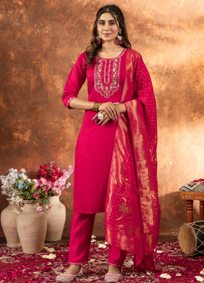 Pink Embroidered Marina Silk Kurta Set With Dupatta Stitched