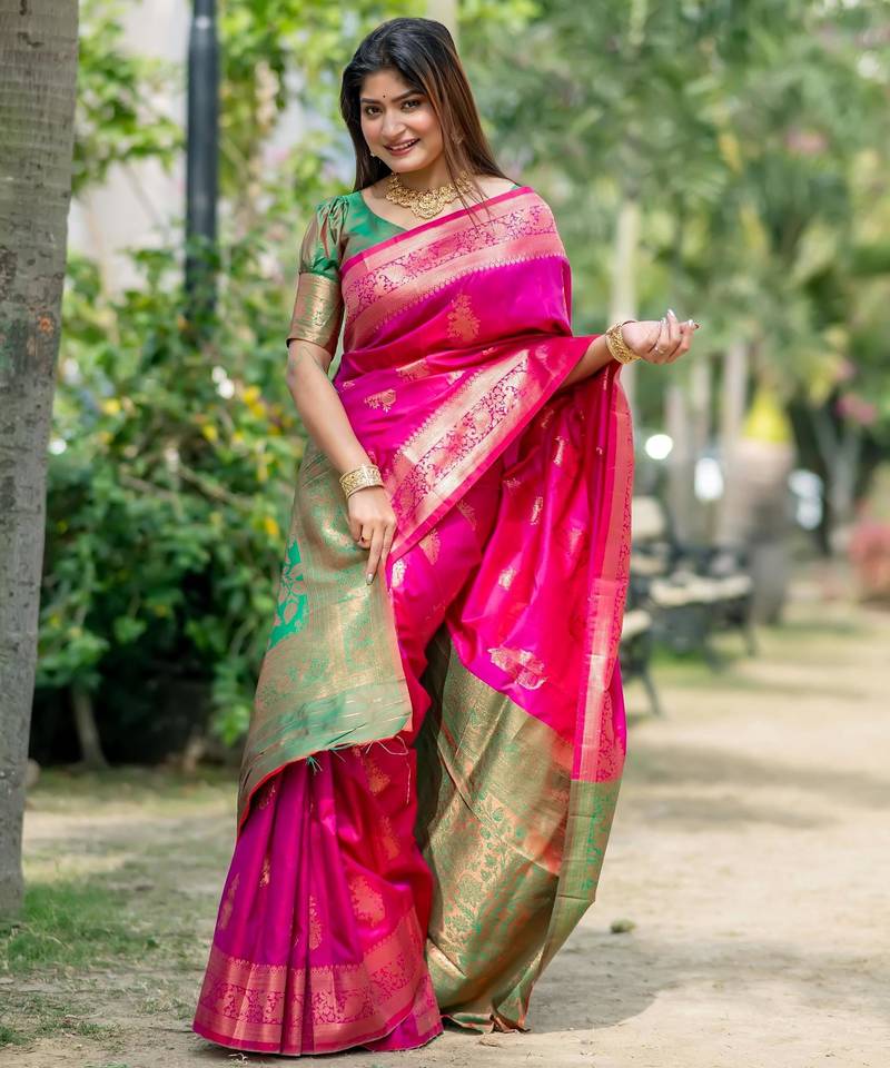 • Saree : Color- Pink / Fabric- Banarasi Silk • Blouse : Color- Green / Fabric- Banarasi Silk Saree Details