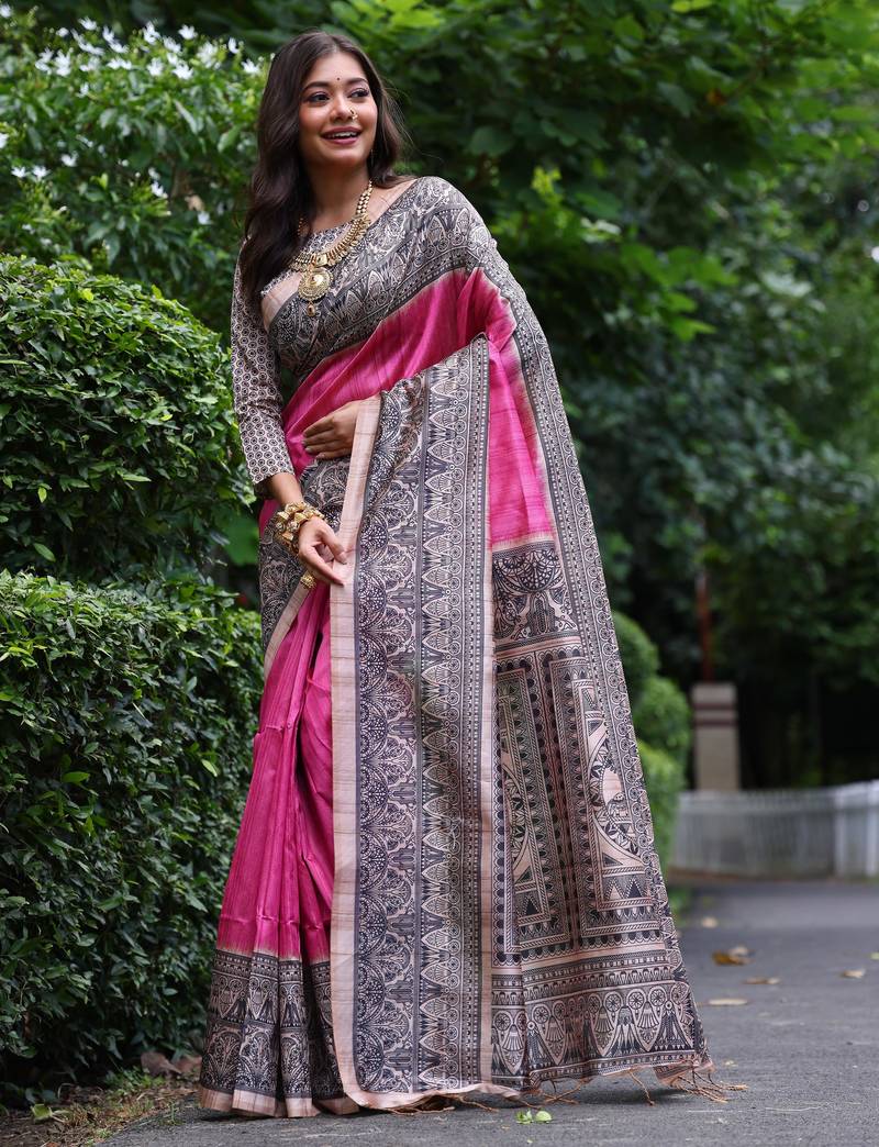 Pink Soft Tussar Silk Madhubani Printed Saree With Blouse