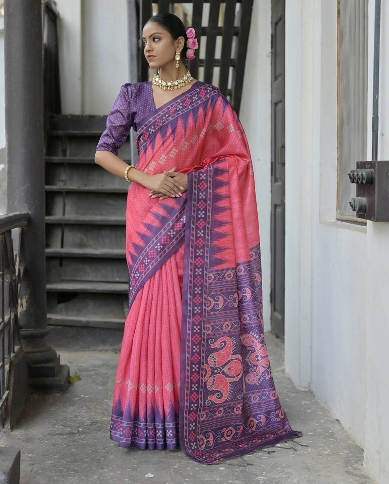 Pink Soft Tussar Silk Temple Border Saree With Blouse