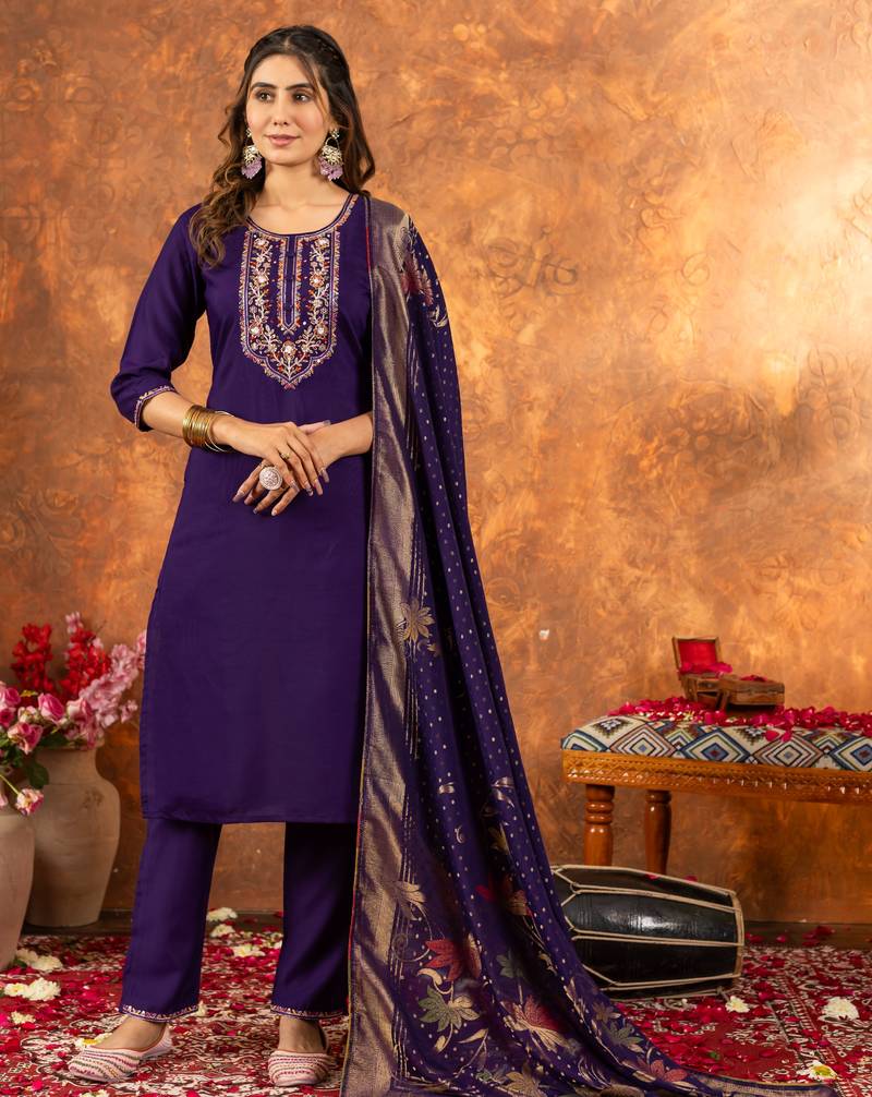 • Product Id : 4709397 • Package Details : 1 Top/1 Bottom/1 Dupatta • Type : Readymade Suits For Women • Region : India • Work : Embroidered • Type : Thread Work • Look : Traditional • Sleeve : Half Sleeve • Neck Style : Round Neck • Fabric : Silk • Color : Purple • Stitching : Stitched Payments [+]