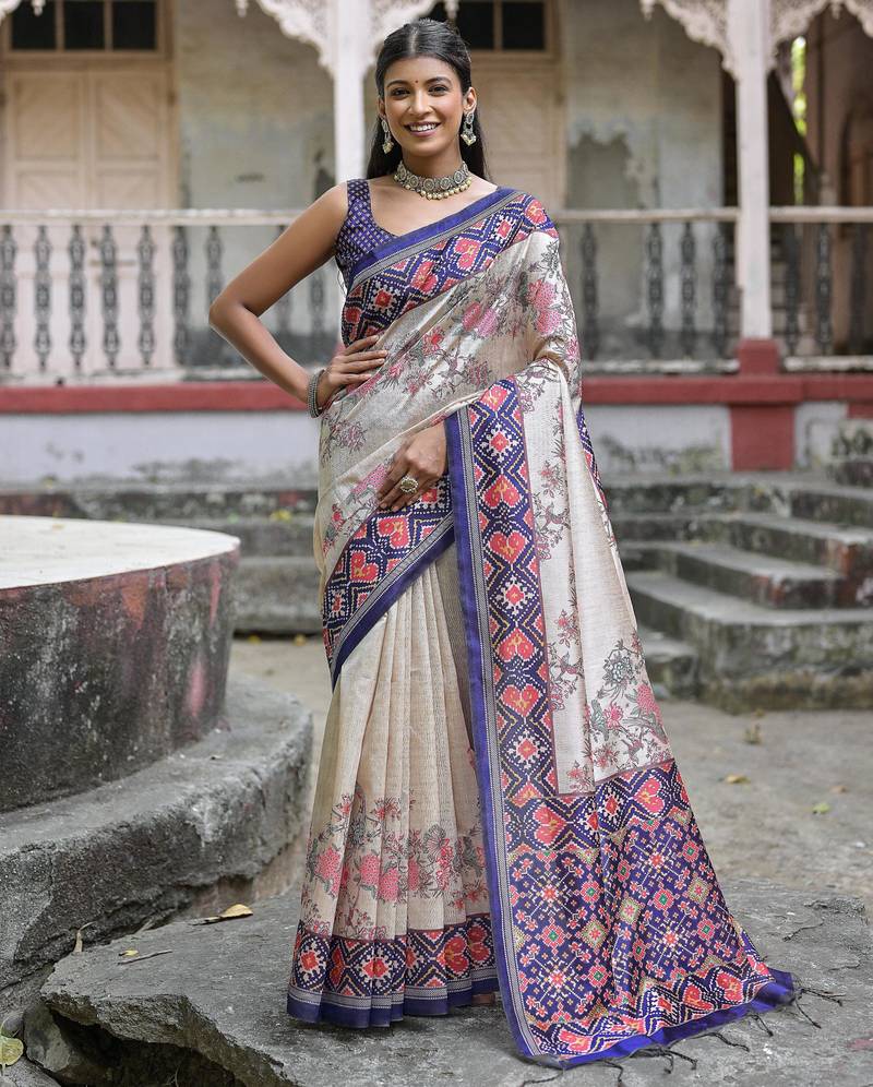 Royal Blue Soft Tussar Silk Floral Printed Saree With Blouse