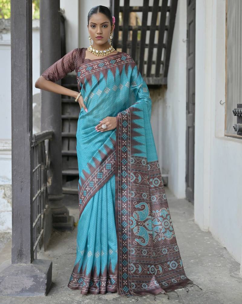 • Saree : Color- Sky Blue / Fabric- Tussar Silk • Blouse : Color- Coffee / Fabric- Tussar Silk Saree Details