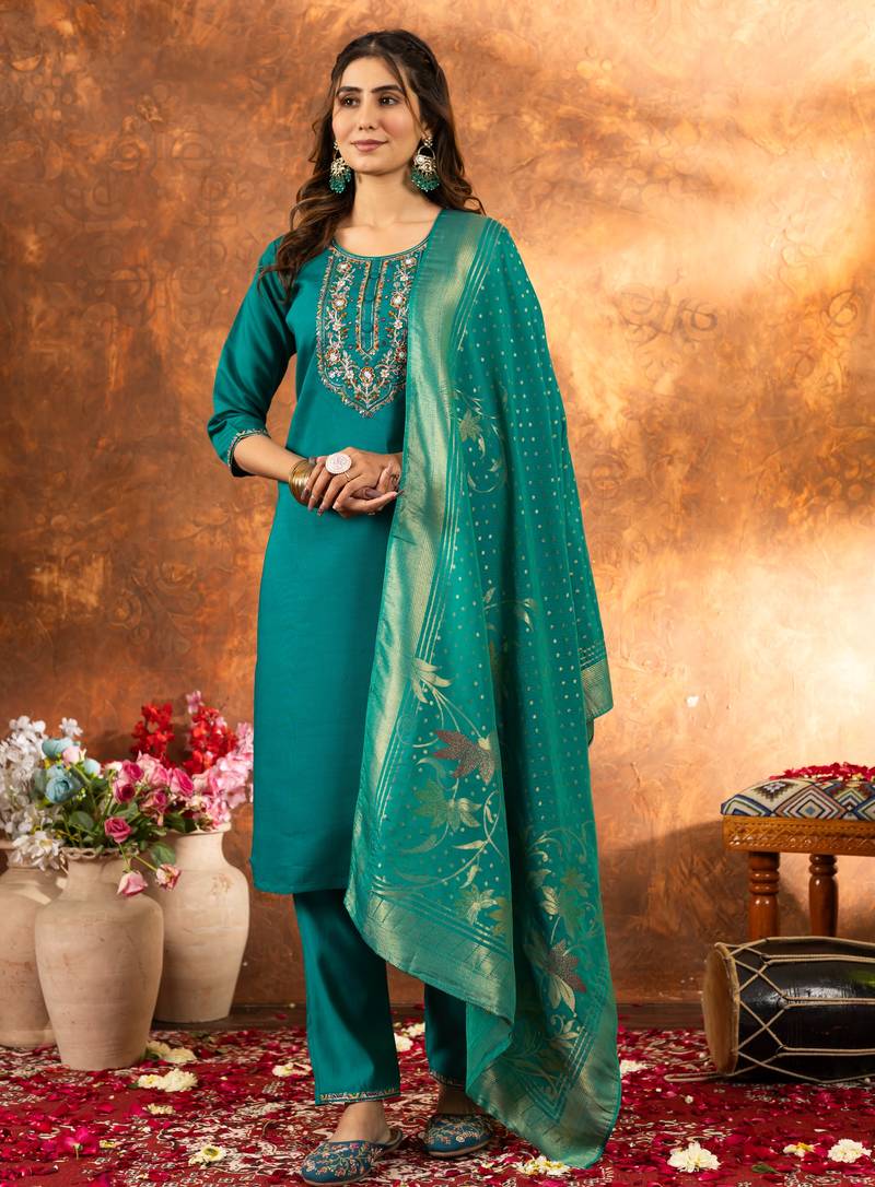 Teal Embroidered Marina Silk Kurta Set With Dupatta Stitched