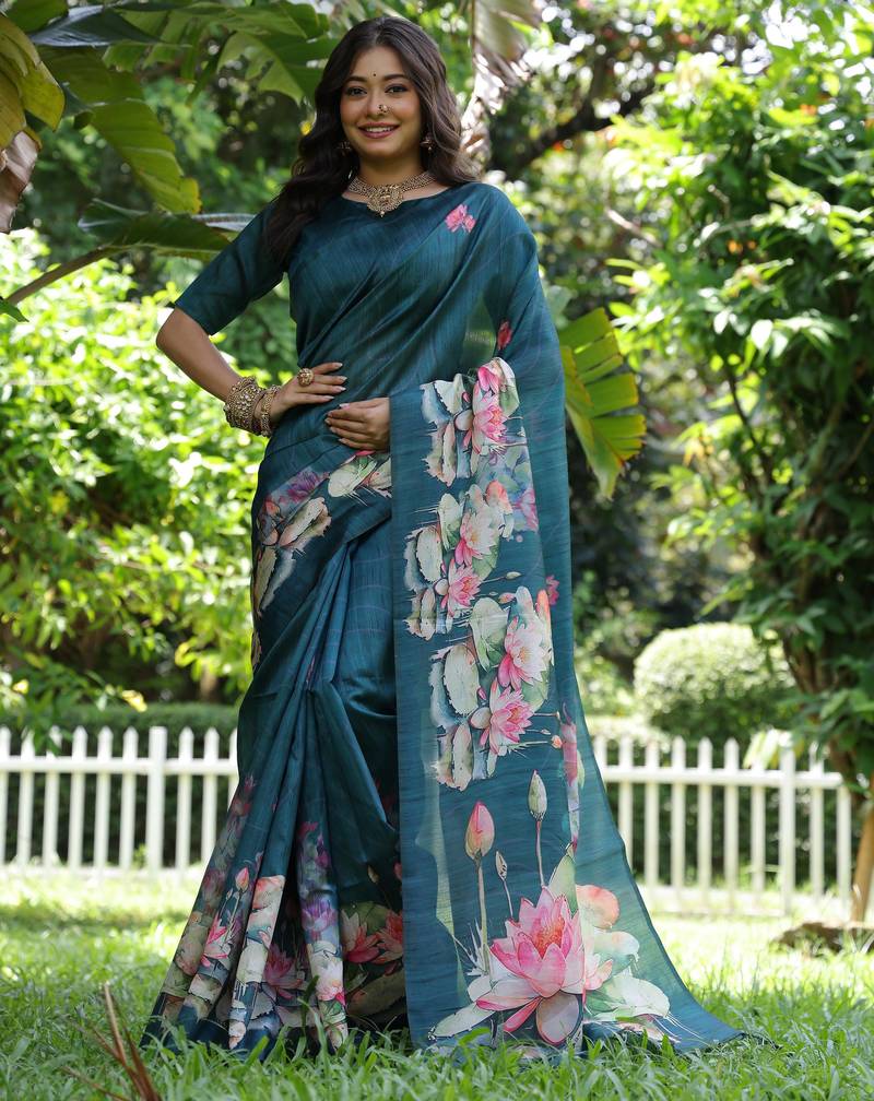 Teal Soft Tussar Silk Floral Printed Saree With Blouse