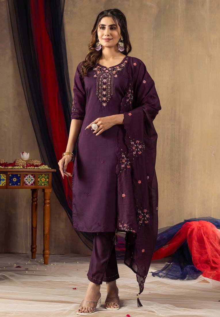 • Product Id : 4709403 • Package Details : 1 Top/1 Bottom/1 Dupatta • Type : Readymade Suits For Women • Region : India • Work : Embroidered • Type : Hand Embroidery • Look : Traditional • Sleeve : Half Sleeve • Fabric : Silk • Color : Wine • Stitching : Stitched • Neck Style : Sweetheart Neck Kameez Payments [+]