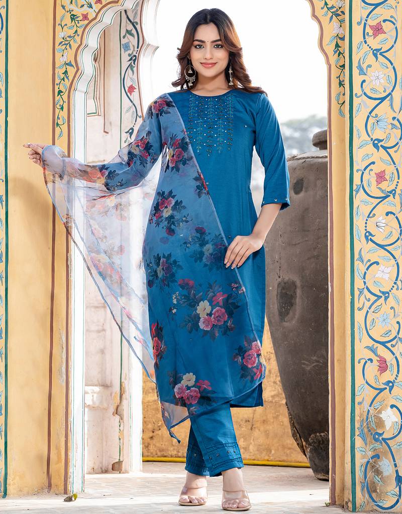Women's Blue Silk Handwork Designer Kurta Set With Dupatta Stitched