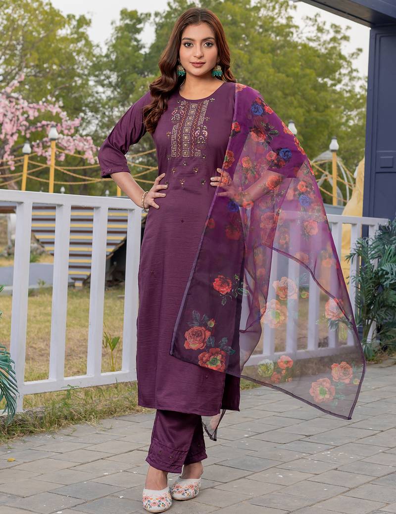 • Product Id : 4702654 • Package Details : 1 Top/1 Bottom/1 Dupatta • Type : Readymade Suits For Women • Region : India • Type : Hand Embroidery • Look : Traditional • Sleeve : Half Sleeve • Neck Style : Round Neck • Work : Multi Head Work • Fabric : Silk • Color : Wine • Stitching : Stitched Payments [+]