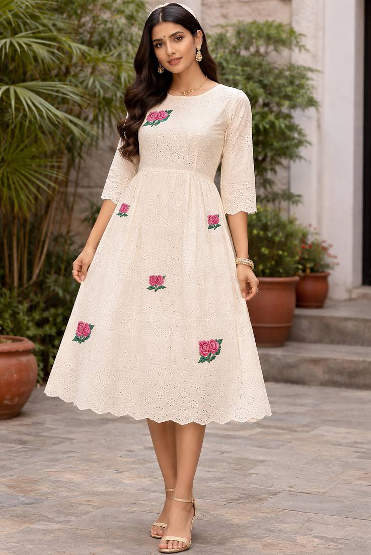 • Product Id : 4733285 • Package Details : 1 Kurta • Type : Embroidered Kurtis • Region : Na • Fabric : Cotton • Work : Embroidered • Type : Dori Embroidery • Look : Fashion • Sleeve : Quarter Sleeve • Neck Style : Round Neck • Color : Beige • Stitching : Stitched • Length : 40.0 Payments [+]