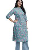 Women's Pure Cotton Straight Turq/Pink With Multi Color Embellished Kurta