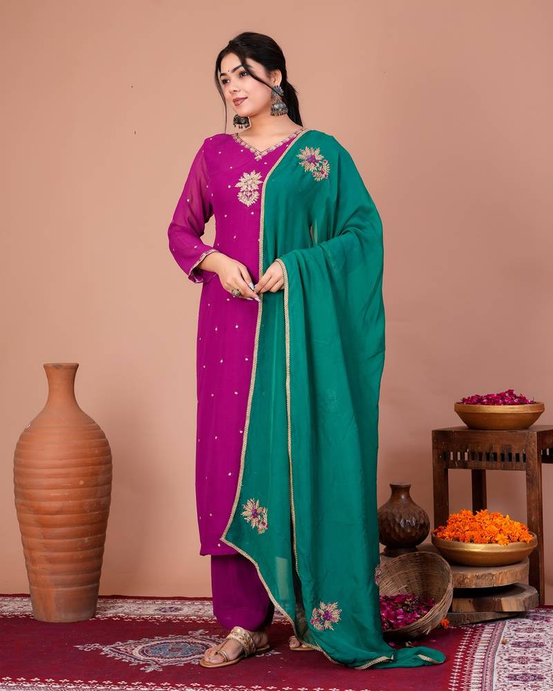 • Product Id : 4714023 • Package Details : 1 Kurta / 1 Pant / 1 Dupatta • Type : Kurta Sets • Fabric : Organza • Work : Embroidered • Sleeve : Quarter Sleeve • Neck Style : V Neck • Color : Purple • Stitching : Stitched • Length : 36.0 Payments [+]