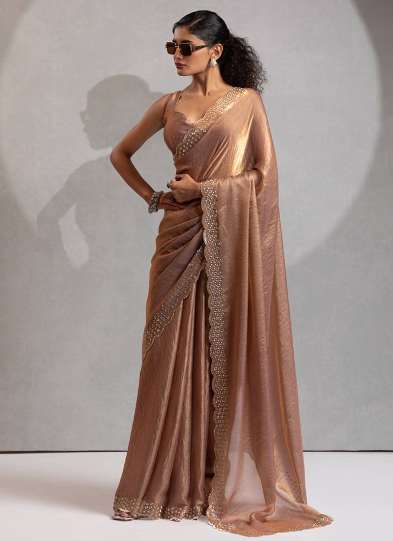 Only great minds can afford a simple style of this preety Gold Two tone silk saree. This beautiful saree comes with Heavy Handwork Zircan with cutdana border work all over the attire with creative design and border looks chic and ideal. This saree comes with unstitched gold color two tone silk blouse.The size of saree is 5.5 meter and blouse size is 0.80 meter.Blouses with elaborate patterns and colors are used for photoshoot. Color and pattern of the blouse might not be as shown in the image. Designs, Colors and patterns on the actual product may slightly vary from designs shown in the image. Images are only representative.
