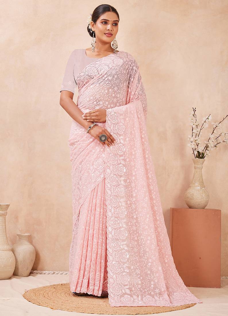 Designer Pink Resham Sequins Embroidery Work Silk Blend Saree