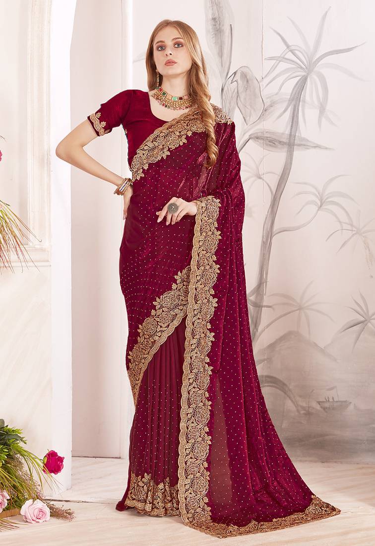 Maroon Zari Resham Embroidery Work Silk Blend Party Wear Saree