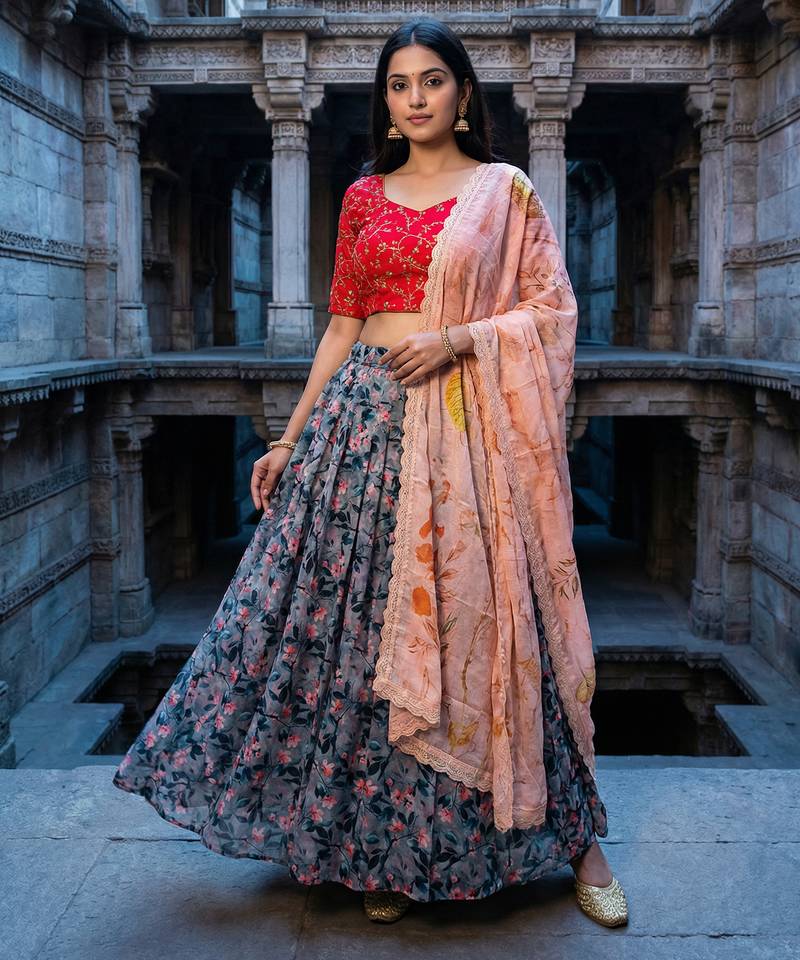 Embroadery Work Printed Semi Stitched Lehenga Choli