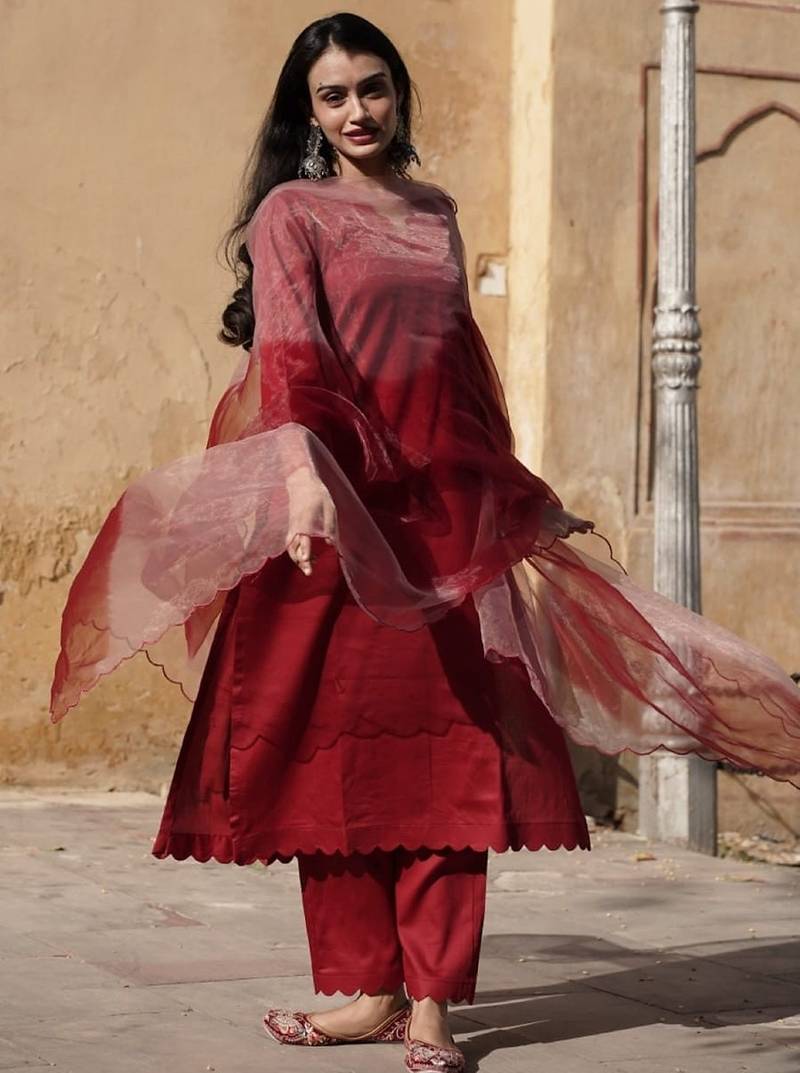 Blood Red Cotton Silk Embroidered Kurta Cut Work Pant With Duptta