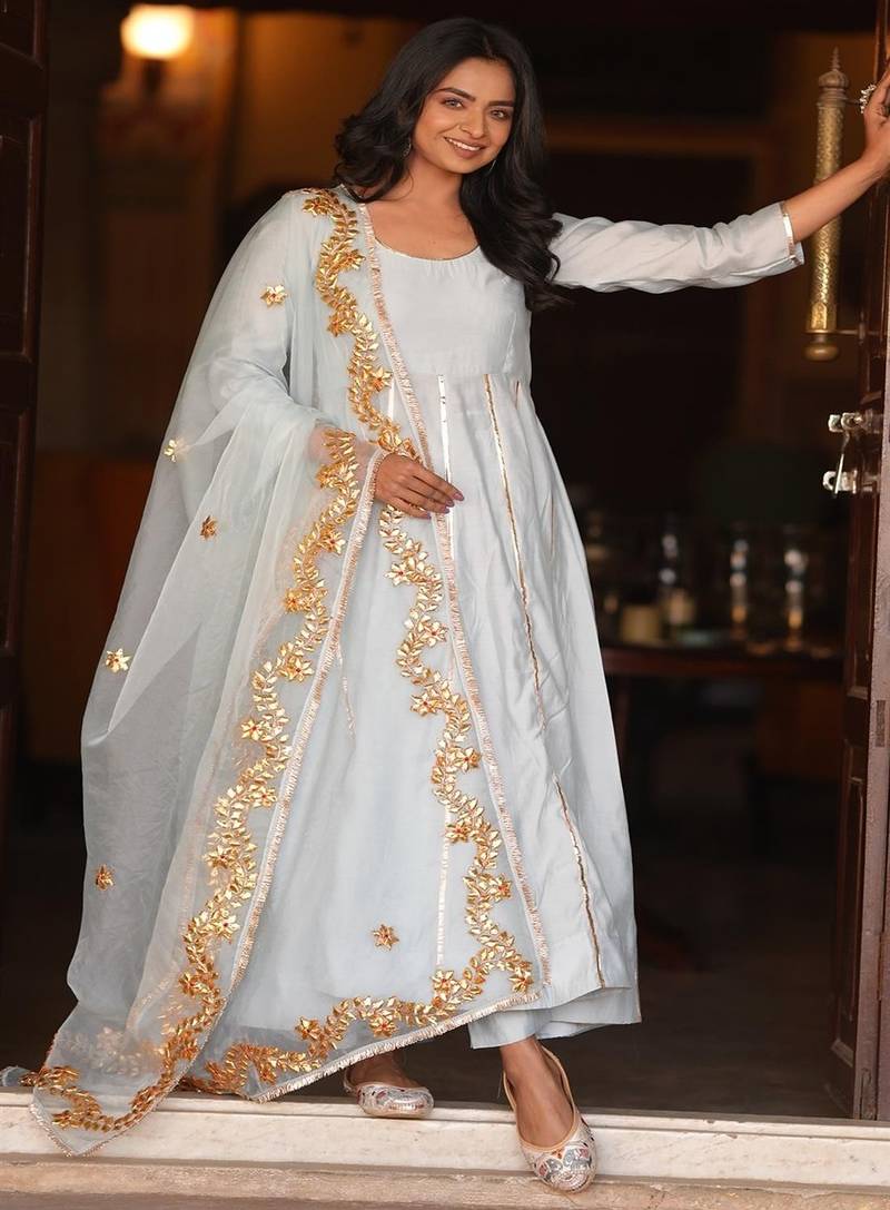 Light Aqua Blue Silk Embroidered Anarkali Pant With Duptta