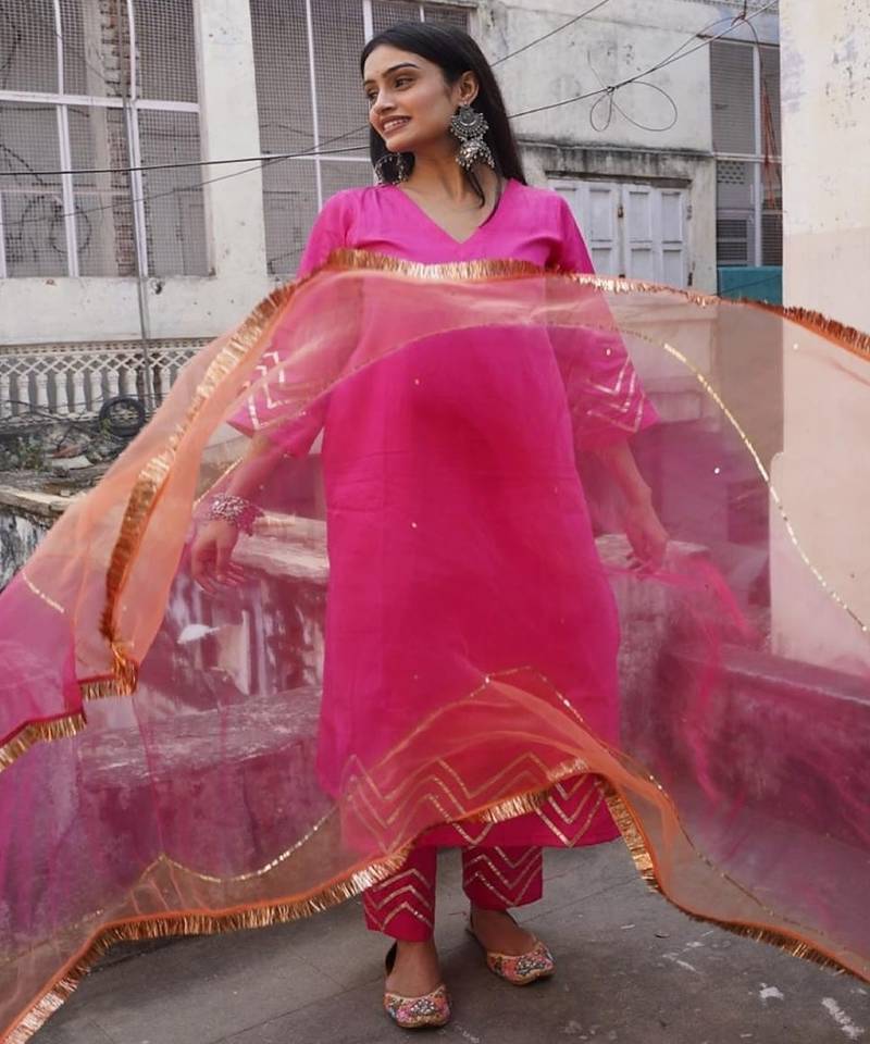 If you find the product for less we'll match it! Know More• Product Id : 4746349 • Package Details : 1 Kurta/ 1 Pant/ 1 Dupatta • Type : Plus Size Kurtis • Fabric : Cotton Silk • Work : Embroidered • Type : Gota Patti • Sleeve : Quarter Sleeve • Color : Light Hot Pink • Stitching : Stitched • Length : 48.0 General - Color and Texture may have slight variation. This happens because of photography.
