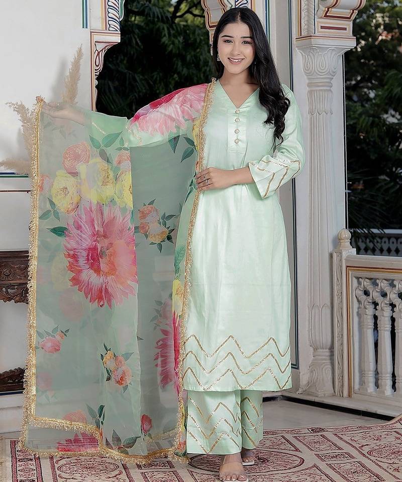 This ethnic outfit is light green gotta work pure jam cotton kurta with a matching oraganza dupatta, a popular style of Indian traditional wear. This is a three-piece suit set featuring anarkali kurta (tunic top), pants (wide-legged and flared, often tiered), and a matching dupatta (scarf).The set is a rich shade,. The kurta has intricate embroidery and gotta work on the round neckline. The hem of the kurta,the borders of the dupatta also feature complementary embroidered or Gota Patti detailing in a contrasting light color, likely silver or white. .This style of embroidered suit set is versatile and often worn for festive celebrations, weddings, parties, or other special occasions.