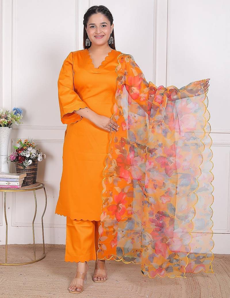 This ethnic outfit is a yellow cutwork pure jam cotton kurta with a matching oraganza dupatta, a popular style of Indian traditional wear. This is a three-piece suit set featuring anarkali kurta (tunic top), pants (wide-legged and flared, often tiered), and a matching dupatta (scarf).The set is a rich shade,. The kurta has intricate embroidery and gotta work on the round neckline. The hem of the kurta,the borders of the dupatta also feature complementary embroidered or Gota Patti detailing in a contrasting light color, likely silver or white. .This style of embroidered suit set is versatile and often worn for festive celebrations, weddings, parties, or other special occasions.