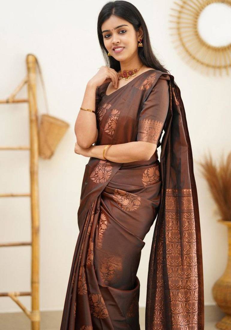 • Color : Brown • Work : Woven • Fabric Of : South Silk • Available : Yes • Size : 80 Cm • Fabric : South Silk • Color : Brown • Work : Woven • As Per Image : No Petticoat Details