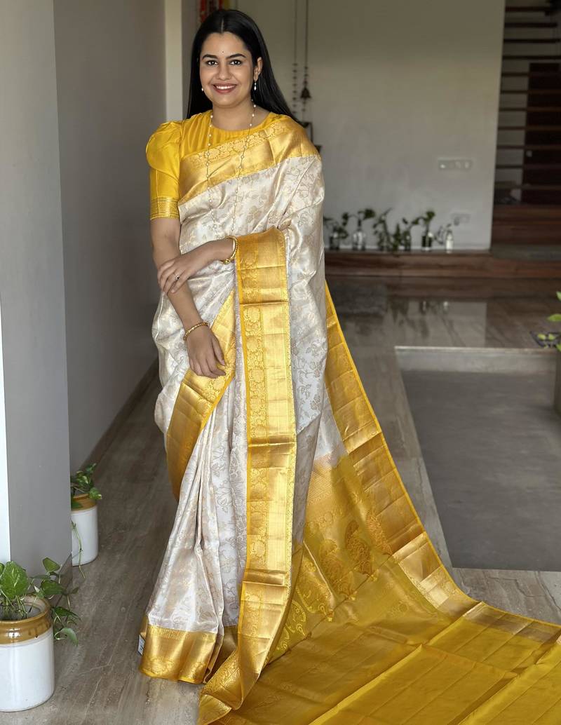 • Color : Cream • Work : Woven • Fabric Of : Silk Blend • Available : Yes • Size : 80 Cm • Fabric : Silk Blend • Color : Cream • Work : Woven • As Per Image : No Petticoat Details