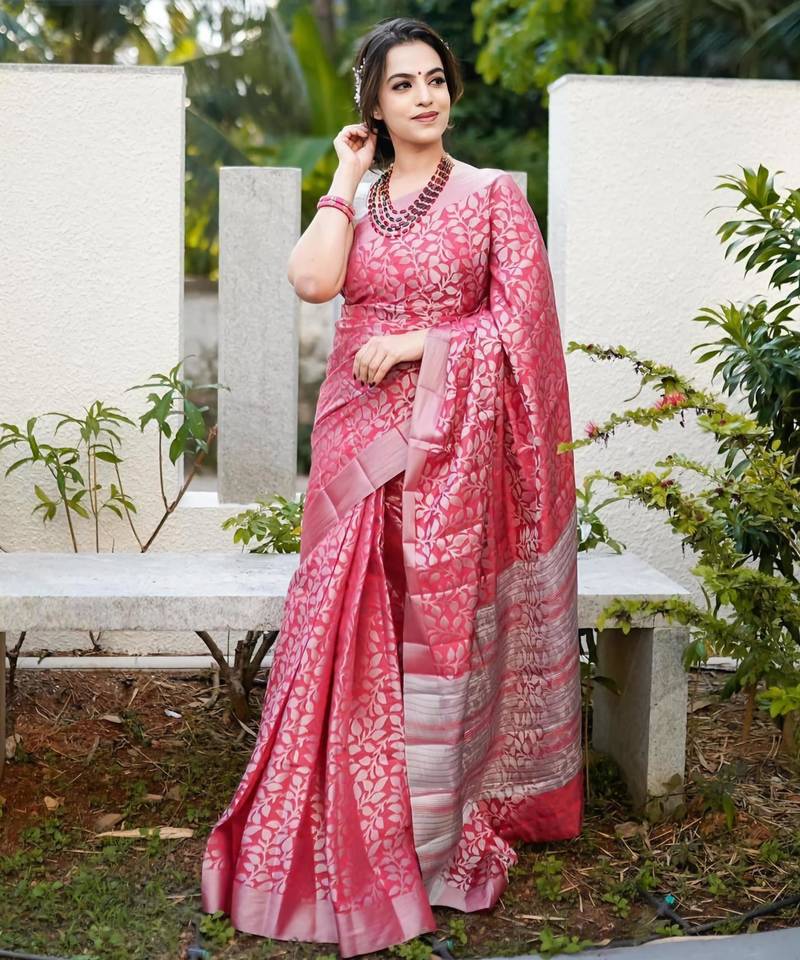 • Color : Pink • Work : Woven • Fabric Of : Pure Silk Blend Other Details