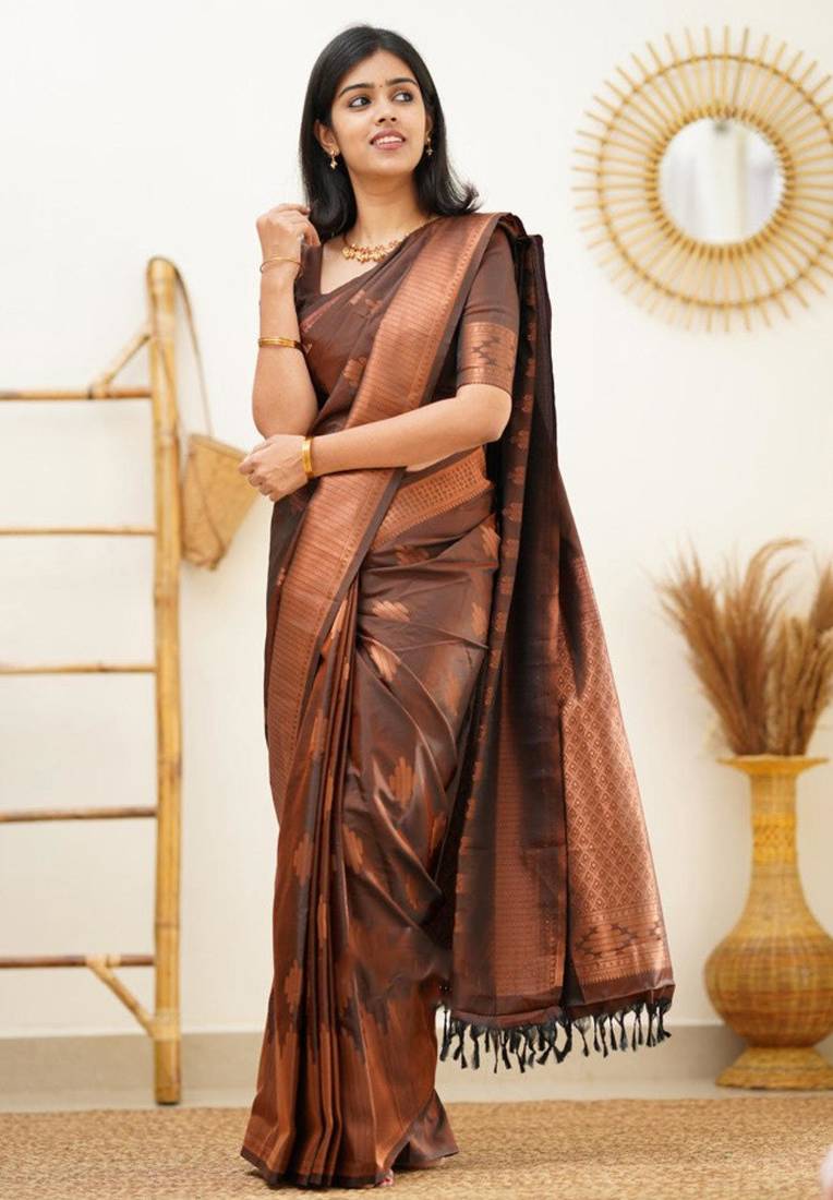 Embellished Brown Jacquard Art Silk Blend Light Weight Saree With Unstitched Blouse
