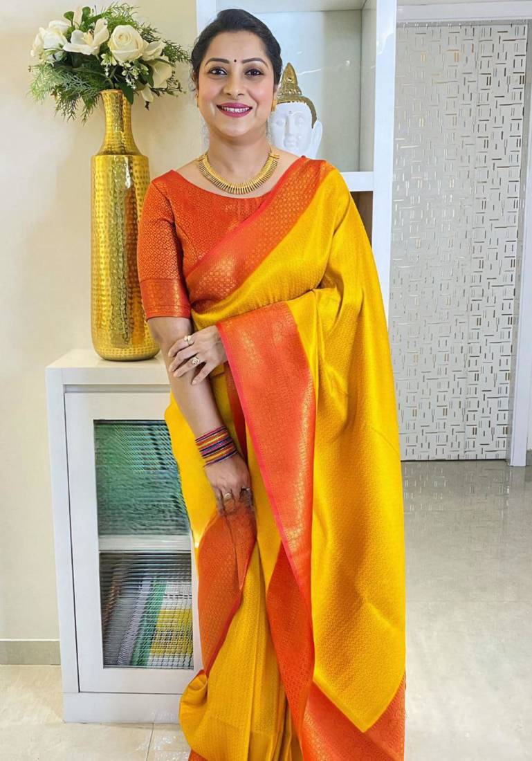 • Border : Contrast Border • Fabric Of : Cotton Silk • Color : Yellow • Color : Yellow Blouse Details