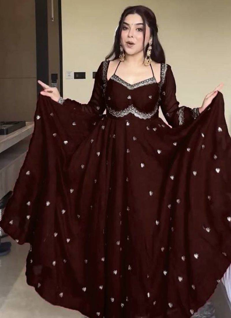 • Product Id : 4672715 • Package Details : 1 Top/1 Bottom/1 Dupatta • Type : Anarkali Suit • Region : Other • Work : Embroidered • Type : Sequins Work • Look : Designer • Sleeve : Full Sleeve • Neck Style : V Neck • Color : Brown • Fabric : Faux Georgette • Stitching : Stitched Payments [+]