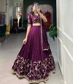 Turn heads this festive season with this regal purple lehenga choli, crafted from rich silk for a luxurious look and feel. The fully stitched lehenga features a graceful flare, finished with a drawstring and zip closure for a secure and comfortable fit. Intricate embroidery and delicate sequins work line the hem, adding elegance and depth to the design. The set includes an unstitched blouse, allowing you to customise the style to your preference, and a matching dupatta with embroidered borders for a cohesive, festive look. Perfect for weddings, sangeet nights, and special celebrations, this purple lehenga choli brings tradition and glamour together effortlessly.