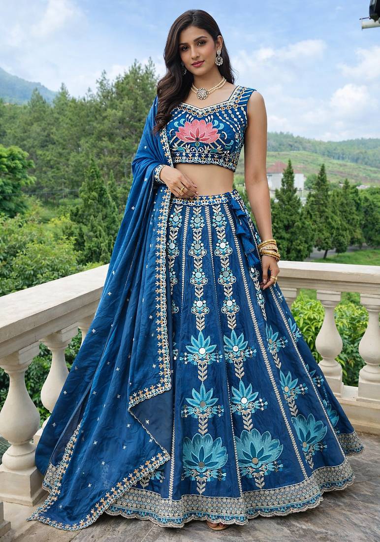 Royal Blue Mirror Work Fendi Silk Lehenga Choli With Dupatta