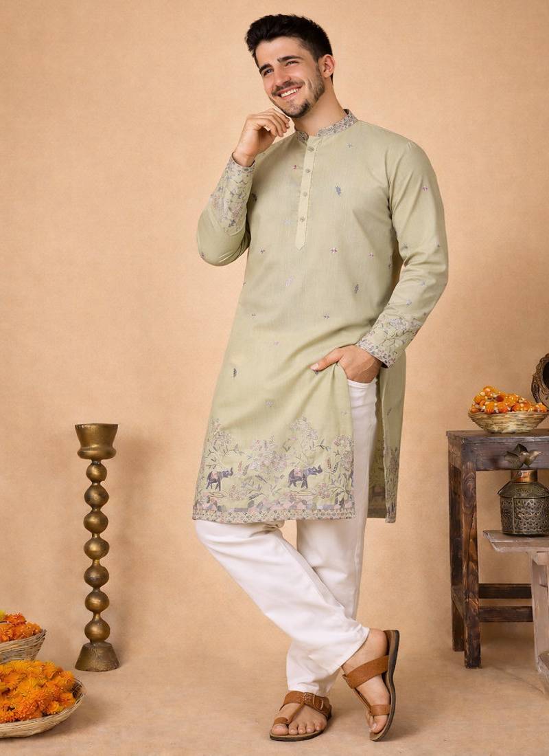 • Product Id : 4725051 • Package Details : 1 Kurta/1 Payjama • Type : Kurta Pajama • Occasion : Wedding • Fabric : Linen • Work : Embroidered • Type : Sequins Work • Look : Traditional • Sleeve : Full Sleeve • Neck Style : Round Neck • Color : Beige • Bottom Fabric : Cotton • Bottom Color : White • Top Color : Beige • Top Fabric : Cotton • Bottom Style : Pyjama • Stitching : Stitched Payments [+]