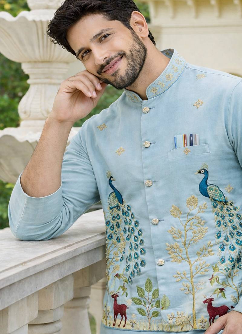 • Product Id : 4698795 • Package Details : 1 Kurta/1 Koti/1 Payjama • Type : Nehru Jacket • Occasion : Wedding • Fabric : Satin • Work : Embroidered • Look : Traditional • Sleeve : Full Sleeve • Neck Style : Round Neck • Color : Blue • Bottom Fabric : Satin • Bottom Color : White • Top Color : Blue • Top Fabric : Satin • Bottom Style : Pyjama • Stitching : Stitched Payments [+]