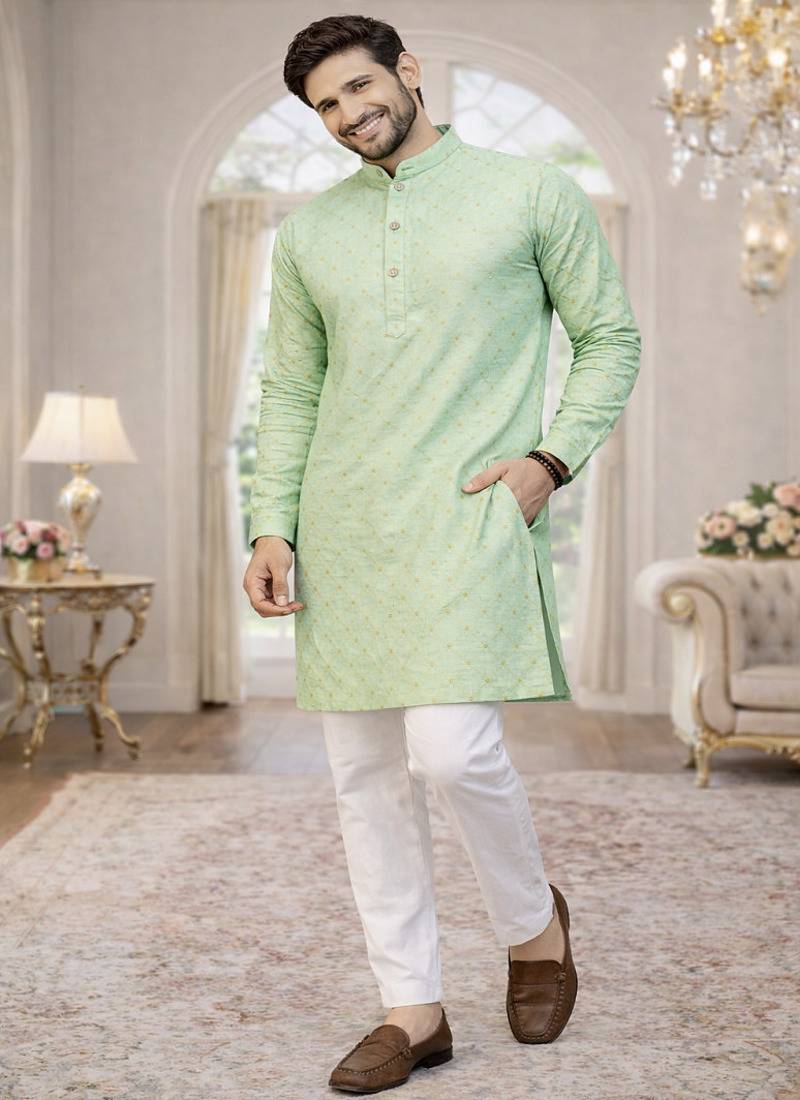 • Product Id : 4698793 • Package Details : 1 Kurta / 1 Payjama • Type : Kurta Pajama • Occasion : Wedding • Fabric : Cotton • Work : Printed • Look : Traditional • Sleeve : Full Sleeve • Neck Style : Round Neck • Bottom Fabric : Cotton • Bottom Color : White • Color : Light Sea Green • Top Color : Green • Top Fabric : Jaquard • Bottom Style : Pyjama • Stitching : Stitched Payments [+]