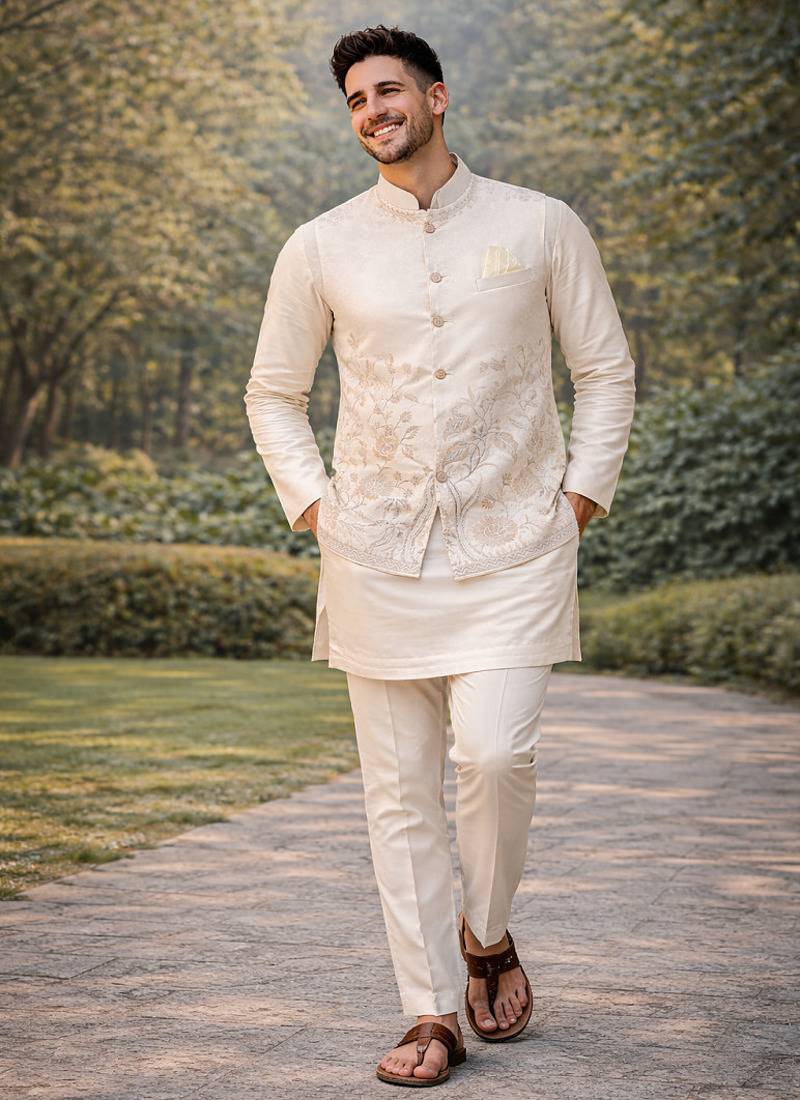 • Product Id : 4725036 • Package Details : 1 Koti/1 Kurta/1 Payjama • Type : Kurta Pajama • Occasion : Wedding • Work : Embroidered • Type : Sequins Work • Look : Traditional • Sleeve : Full Sleeve • Neck Style : Round Neck • Color : Beige • Bottom Color : Off White • Top Color : White • Bottom Style : Pyjama • Top Fabric : Silk Blend • Bottom Fabric : Silk Blend • Fabric : Silk Blend • Stitching : Stitched Payments [+]