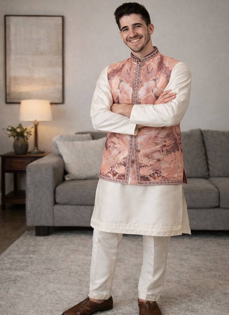 • Product Id : 4725033 • Package Details : 1 Koti/1 Kurta/1 Payjama • Type : Kurta Pajama • Occasion : Wedding • Work : Woven • Type : Zari Work • Look : Traditional • Sleeve : Full Sleeve • Neck Style : Round Neck • Bottom Color : Off White • Color : Peach • Top Color : White • Bottom Style : Pyjama • Top Fabric : Silk Blend • Bottom Fabric : Silk Blend • Fabric : Silk Blend • Stitching : Stitched Payments [+]