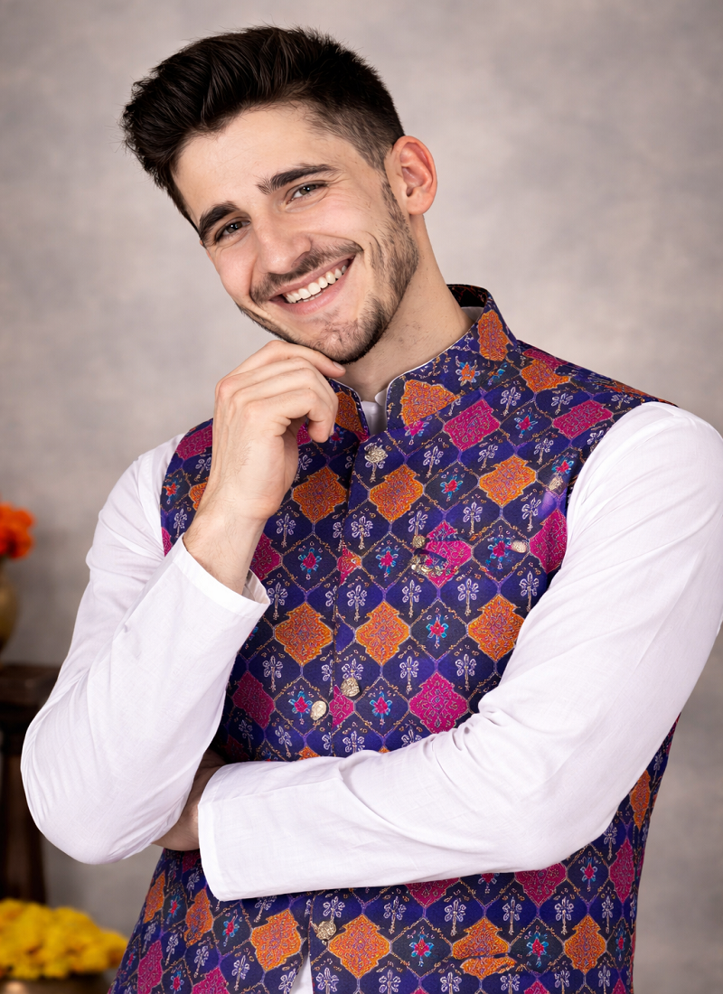 bring a stylish traditional look with this purple color koti kurta pajama set made from cotton silk fabric. the koti is designed with jacquard weaving work featuring multicolor woven patterns that give a rich and festive appearance. the kurta and pajama in white color create a perfect contrast with the purple koti.
