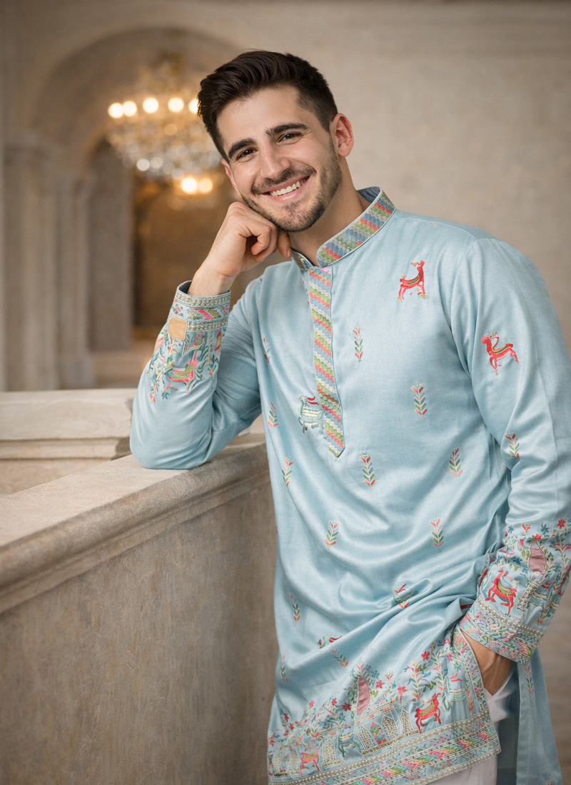 Sky Blue Color Multi Thread Embroidery Work Silk Kurta Payjama Set