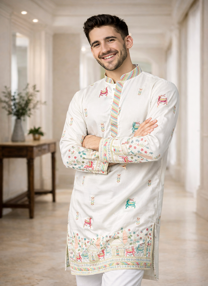 • Product Id : 4730599 • Package Details : 1 Kurta/1 Payjama • Type : Kurta Pajama • Region : Round Neck • Work : Embroidered • Type : Thread Work • Color : White • Bottom Fabric : Cotton • Bottom Color : White • Top Color : White • Bottom Style : Pyjama • Top Fabric : Silk Blend • Fabric : Silk Blend • Stitching : Stitched Payments [+]