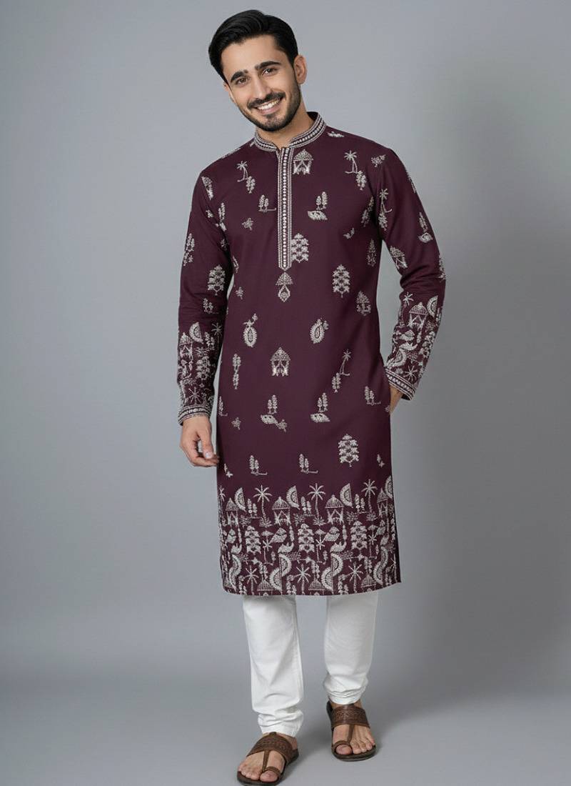 • Product Id : 4698797 • Package Details : 1 Kurta / 1 Payjama • Type : Kurta Pajama • Occasion : Wedding • Work : Printed • Look : Traditional • Sleeve : Full Sleeve • Neck Style : Round Neck • Bottom Fabric : Cotton • Bottom Color : White • Color : Wine • Top Color : Maroon • Bottom Style : Pyjama • Top Fabric : Chanderi Silk • Fabric : Chanderi Silk • Stitching : Stitched Payments [+]