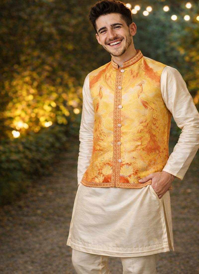 • Product Id : 4725035 • Package Details : 1 Koti/1 Kurta/1 Payjama • Type : Kurta Pajama • Occasion : Wedding • Work : Woven • Type : Zari Work • Look : Traditional • Sleeve : Full Sleeve • Neck Style : Round Neck • Color : Yellow • Bottom Color : Off White • Top Color : White • Bottom Style : Pyjama • Top Fabric : Silk Blend • Bottom Fabric : Silk Blend • Fabric : Silk Blend • Stitching : Stitched Payments [+]