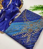 • Product Id : 3446966 • Package Details : 1 Top / 1 Bottom / 1 Dupatta • Type : Dress Materials • Region : Other • Occasion : Ceremonial • Type : Bandhej • Look : Traditional • Sleeve : Quarter Sleeve • Stitching : Unstitched • Fabric : Jacquard • Color : Blue • Work : Bandhej Stitching [+]