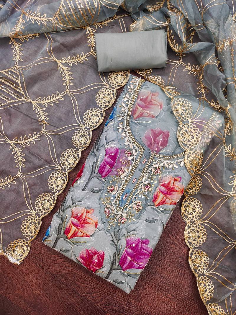 • Product Id : 4672415 • Package Details : 1 Top / 1 Bottom /1 Dupatta • Type : Dress Materials • Region : Other • Type : Floral Print • Look : Traditional • Sleeve : Quarter Sleeve • Stitching : Unstitched • Fabric : Organza • Color : Grey • Work : Floral Print - 5-8 business days in addition to order delivery time.This service is provided to customers outside India only.