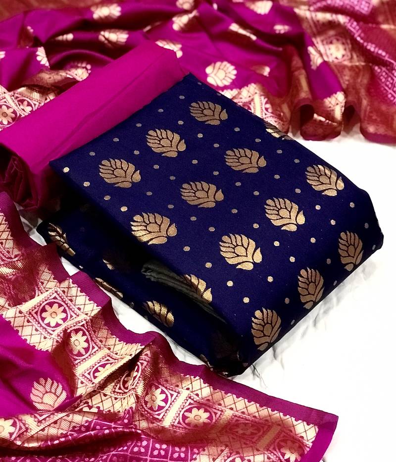 • Product Id : 4067198 • Package Details : 1 Top / 1 Bottom / 1 Dupatta • Type : Dress Materials • Region : Other • Type : Banarasi Silk • Look : Traditional • Sleeve : Quarter Sleeve • Stitching : Unstitched • Fabric : Brocade • Color : Blue • Work : Floral Print Stitching [+]