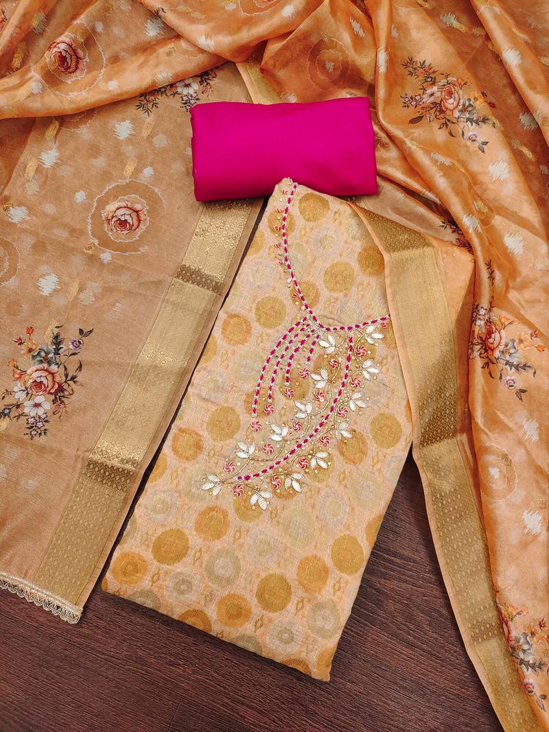 Kimisha Presents Beautifully Designed & Latest In Trends Women's Ethnic Premium Jacquard Embellished Unstitched Straight Suit. It Is Available In Free Size And Can Be Stitched To Suit Your Measurements. It Is Alterable Up To Chest Size Of 46, Comes With Organza Fancy Dupatta and Plain Rayon Un-Stitched Bottom. This Dress Would Add Elegance To Your Look. Wear It At Any Occasion By Pairing It With Matching Ethnic Jewelary Like Ethnic Jumkas And Ethnic Footwear Like Mojaris and Juties To Get Complete Ethnic As Well As Fab Festive Look & Get Complimented For Your Impressive Choice.