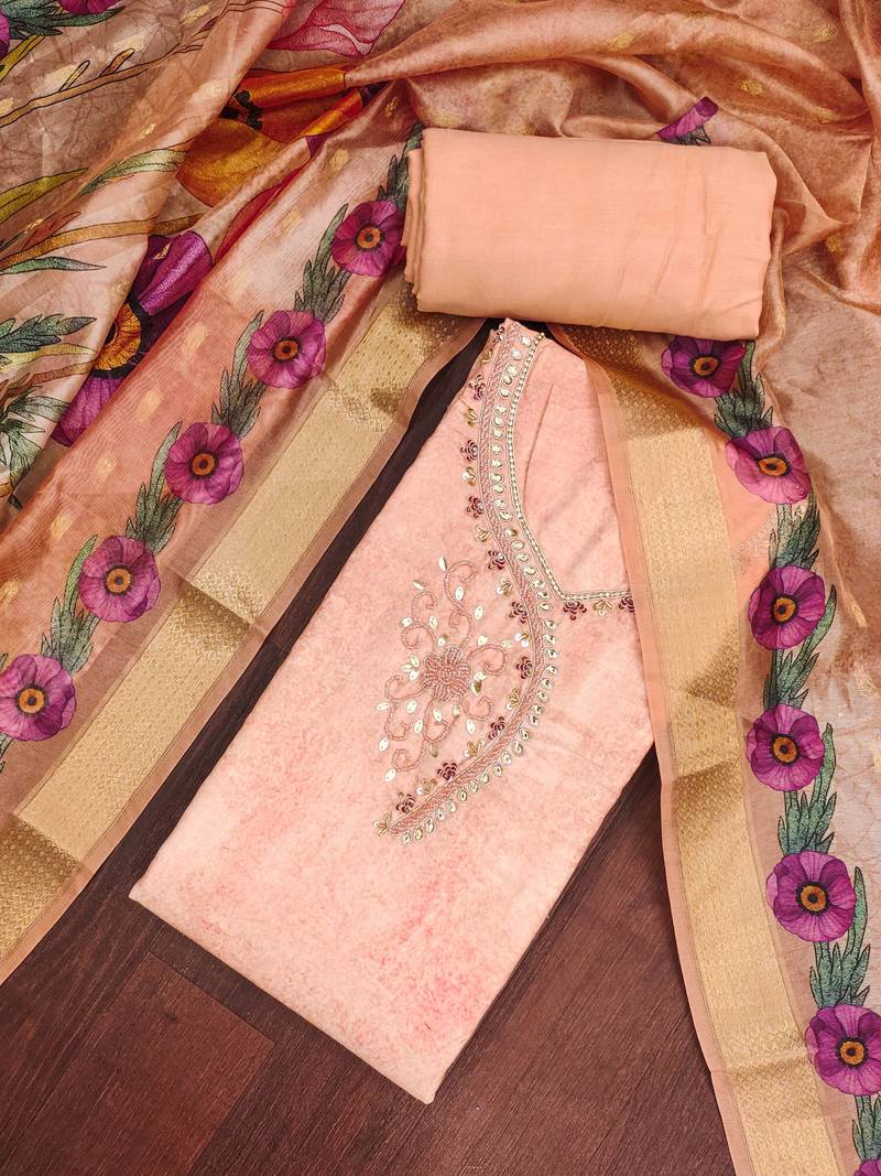 Peach Rayon Cotton Embellished Unstitched Dress Material